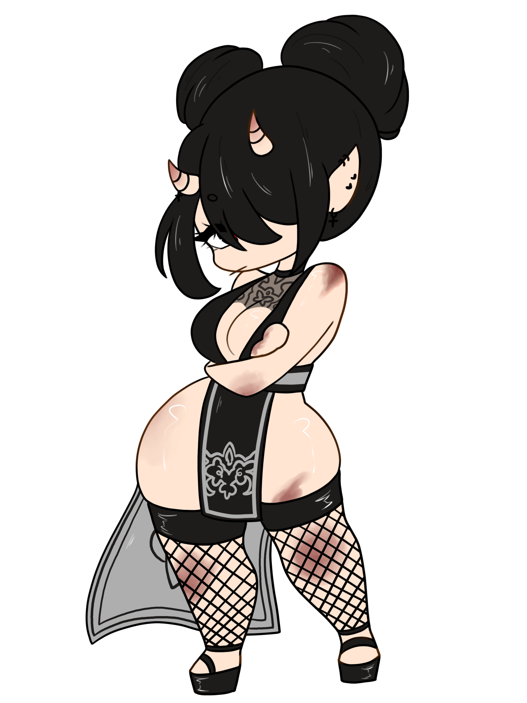 notable features. Two sharp, curling oni horns rise from just above her temples, dark and lacquered like blood-polished obsidian. Her skin is pale and unnaturally smooth, but marked by fading bruises and ancient scars that never truly heal — as though her body remembers every blow, even when her voice does not. Her gaze lingers long, unreadable. She moves like whispered sin — deliberate, sinuous, and always watching.